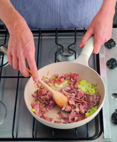 Pulite un cipollotto, tagliatelo a fettine sottili e fatelo soffriggere in una padella con 4 cucchiai di olio. Unite 80 g di prosciutto crudo a striscioline e cuocetelo su fuoco vivo finché risulterà croccante. Lasciate intiepidire.