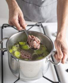 Unite le verdure al brodo quindi aggiungete la carne di manzo macinata, 1 albume e mescolate con la frusta. Cuocete e aromatizzate a piacere.