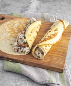 Portate a cottura i funghi, incorporate il grana grattugiato e la panna. Farcite le crepe con il ripieno ai porcini, arrotolatele e allineatele in una teglia da forno unta di burro. Copritele con besciamella morbida e infornate a 180° per 15 minuti.