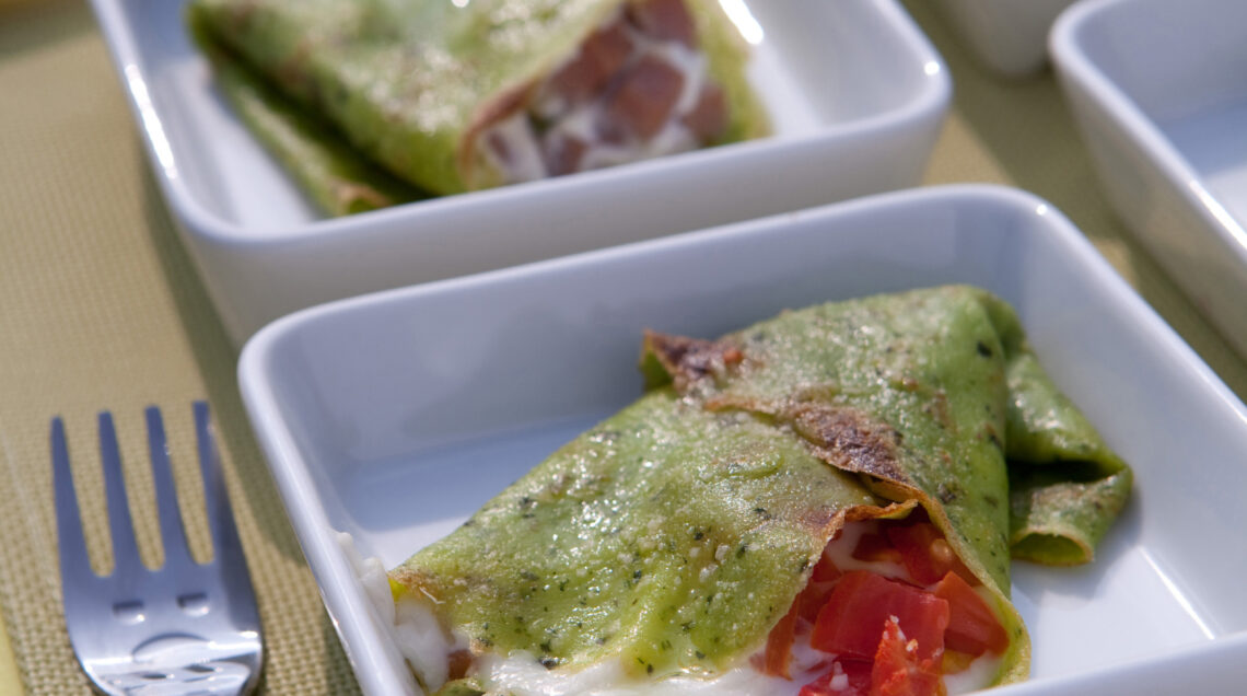 1) Per preparare la ricetta delle crepe al pesto disponi in una ciotola la farina setacciata a fontana e sgusciaci al centro le uova. Aggiungi il pesto e impasta fino a ottenere una pastella abbastanza densa. Unisci al composto una noce di burro fuso e il latte a filo. Continua a mescolare per incorporare gli ingredienti e copri la ciotola con un foglio di pellicola trasparente. Lascia riposare l’impasto in frigo per un’ora.