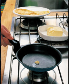 2) Scalda un padellino antiaderente di 18 cm e versa un mestolo di pastella; inclina il padellino su tutti i lati in modo da distribuirla in maniera uniforme e cuoci la crèpe per mezzo minuto per parte; continua in questo modo a formare tutte le altre crèpe fino al termine della pastella.