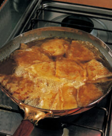 4) Unisci le crèpes piegate a ventaglio, succo d’arancia e cointreau e falle saltare per un minuto. Versa il cognac caldo e infiammalo.
