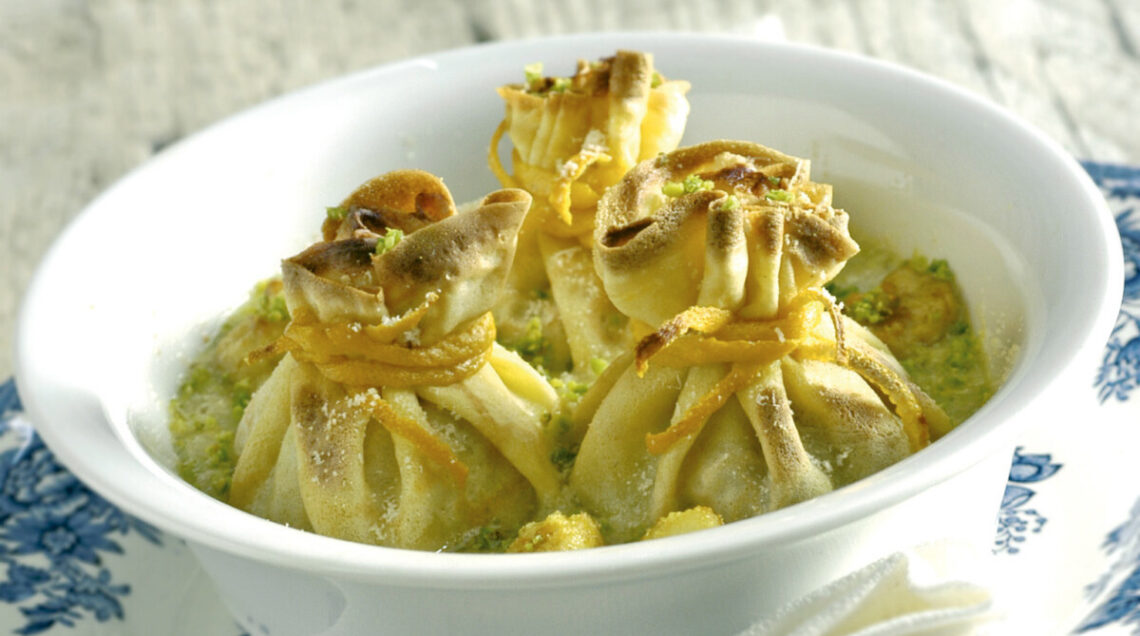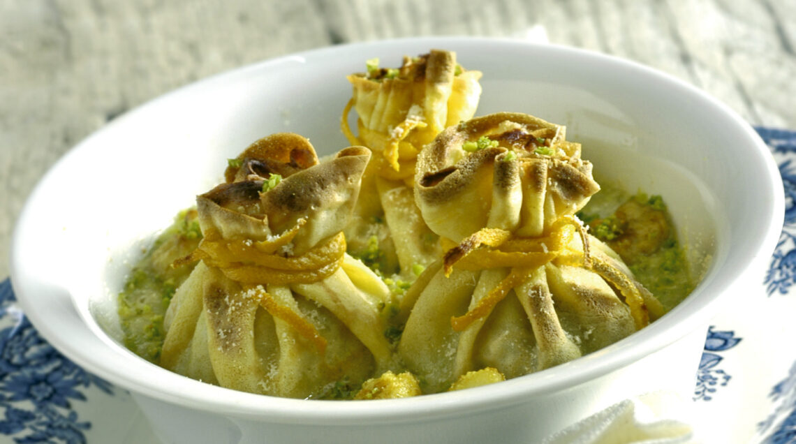 3 Sciogliete il burro rimasto in una casseruola, amalgamatevi il resto della farina e dei pistacchi tritati, diluite con il fumetto caldo e cuocete 5 minuti; regolate di sale e versate la salsa intorno ai fagottini di crespelle. Cospargete con il grana e gratinate in forno a 220° per circa 15 minuti.
