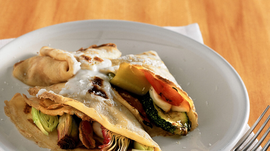 4) Infine metti le verdure nelle crespelle insieme a pezzi di crescenza, piega le crespelle saporite con verdure filanti in 4 e passale in forno prima di servirle.