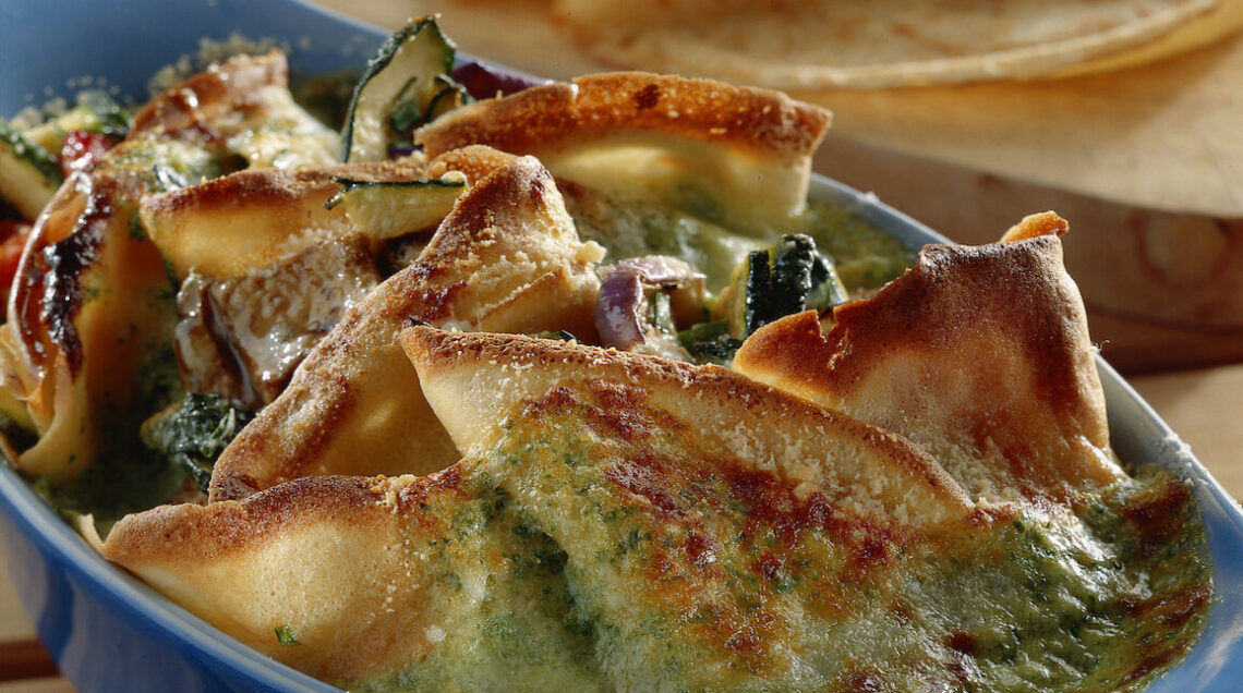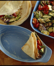 Scaldate in un padellino da crepe una noce di burro, versatevi un mestolino di pastella, stendetela uniformemente, rigirando il padellino, e cuocetela su entrambi i lati. Continuate a cuocere le altre crespelle: ne otterrete 8. Suddividete le verdure al centro delle crespelle, ripiegatele a metà e ancora a metà, a formare degli spicchi, e disponetele in pirofiline imburrate.