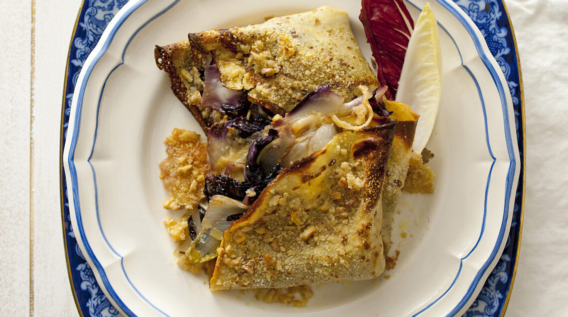 La pastella per queste crespelle è preparata con l'aggiunta di farina di ceci che rende il composto corposo e vellutato. La nota lievemente dolce della pastella contrasta con il carattere amaro di radicchio e indivia, ammorbidito dalla pastosità della scamorza fusa. Piacevole il gusto croccante delle noci che si sposa con ortaggi e ripieno.