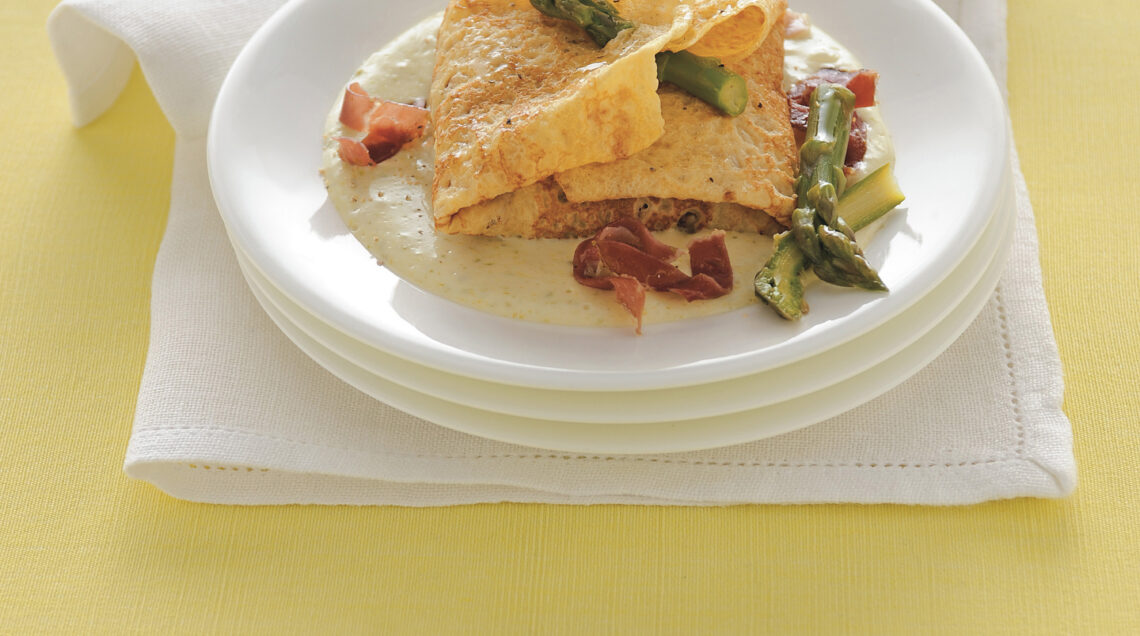 3) Distribuisci asparagi e speck al centro delle crepes, chiudile a pacchetto, fermale con le punte di asparagi tenute da parte, mettile nei piatti e cospargi con il burro rimasto a fiocchetti e il grana rimasto.