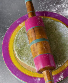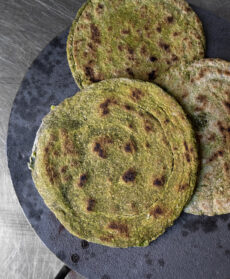 Scottate gli spinacini in acqua bollente salata per 2 minuti, scolateli e fateli raffreddare con acqua e ghiaccio. Poi strizzateli e frullateli con il peperoncino e lo zenzero fino a ottenere una purea. In una ciotola, versate la farina integrale, unite gli spinacini, il cumino, 1 cucchiaino di sale, 1 noce di burro chiarificato e impastate unendo, poca alla volta, 1 dl di acqua fino a ottenere un impasto sodo. Formate una palla, mettetela in una ciotola, coprite e fate riposare per 30 minuti.
