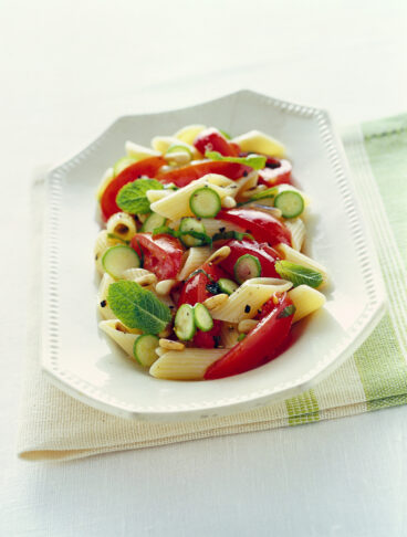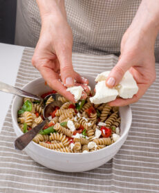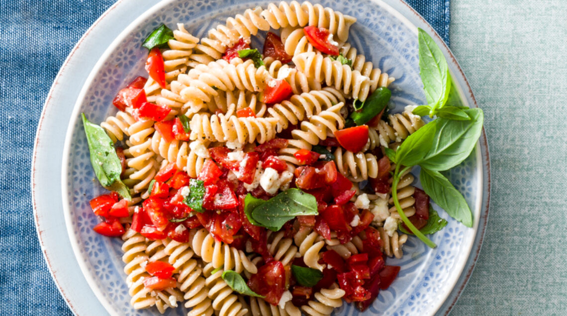 Cuocete 300 g di fusilli corti integrali, scolateli, conditeli con la crudaiola, mescolate e completate con 50 g di feta sminuzzata.
