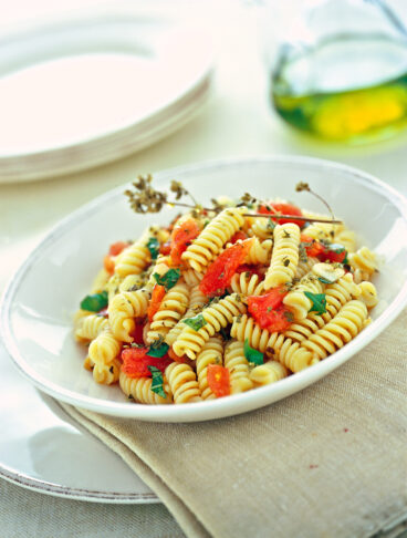 Pomodori crudi, insaporiti con cipollotto, basilico, peperoncino e olio e fusilli appena scolati. Un incontro idilliaco per il palato