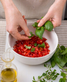 Tagliate a metà 300 g di pomodorini misti (ciliegina, datterini ecc.), strizzateli leggermente per eliminare i semi, quindi tagliateli a dadini; tagliate a dadini anche un paio di cipollotti rossi di Tropea, poi raccogliete il tutto in una ciotola. Unite 4 foglie di basilico spezzettate, 1 cucchiaino di origano, 1 peperoncino rosso, 2 cucchiai di olio, sale. Lasciate riposare per un'ora.
