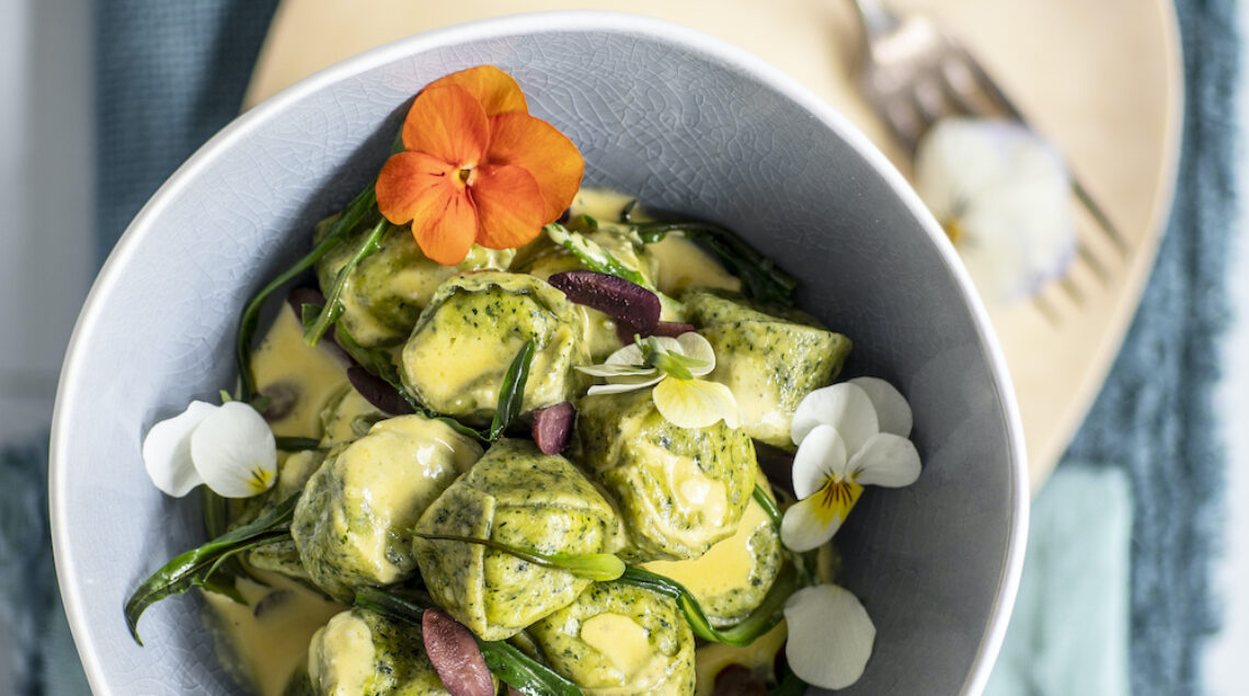 4) Frullate le uova sode con 2 cucchiai di acqua, 4 di olio, il grana, sale e pepe. Cuocete i ravioli in acqua bollente salata con le punte di cicoria tenute da parte, scolateli, conditeli con la crema di uova e unite olive e fiori.