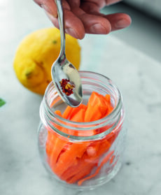 Dieci giorni prima, preparate le carote fermentate: pelatele, tagliatele a bastoncini sottili nel senso della lunghezza e metteteli sottovuoto con 20 g circa di scorza di limone grattugiata, un pezzetto di peperoncino e un pizzico di sale. Lasciate riposare a temperatura ambiente per circa 10 giorni. Se non possedete l'attrezzo per il sottovuoto, chiudetele ermeticamente in un vasetto di vetro.