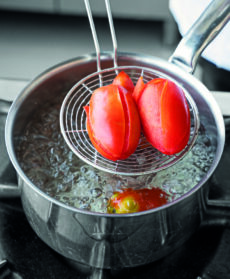 Incidete i pomodori San Marzano nel senso della lunghezza e scottateli in acqua bollente per 1 minuto.