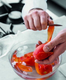 Scolateli e trasferiteli in una ciotola con acqua e ghiaccio. Quindi spellateli e adagiateli, interi, su una teglia foderata con carta da forno.