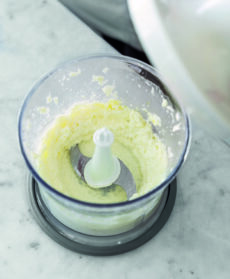Riducete la mozzarella a pezzi, metteteli nel bicchiere del cutter, unite qualche goccia di succo di limone, poco olio e frullate. Dovrete ottenere un composto molto morbido: se necessario, aggiungete qualche cucchiaio del liquido di governo della mozzarella.