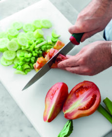 Pelate i cetrioli e riduceteli a rondelle. Pulite il sedano e i pomodori cuore di bue e tagliateli a pezzetti.