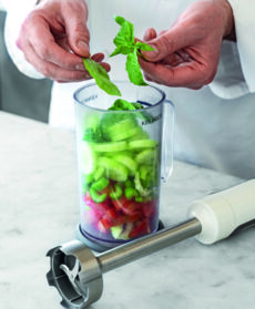Frullate tutti gli ortaggi con qualche foglia di basilico, poco olio e un pizzico di sale. Al termine, passate al setaccio per eliminare eventuali semi e filamenti. Tenete in frigo fino al momento di servire.