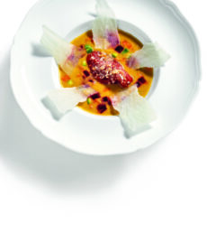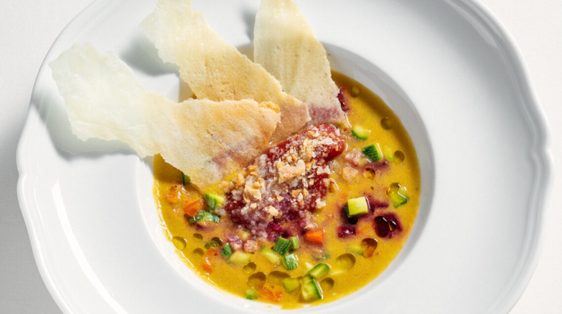 Una versione napoletana del famoso gazpacho andaluso, con pomodori cuore di bu, mozzarella di bufala e carote fermentate