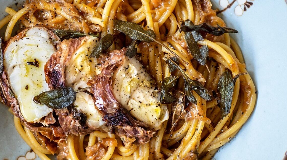 3) Insaporite le cipolle con la colatura di alici. Lessate i bucatini in acqua bollente salata, scolateli e conditeli con le cipolle e distribuiteli nei piatti. Affettate il pesce, disponetelo sulla pasta e pepate. Completate con le restanti foglie di salvia fritte con 2-3 cucchiai di olio.