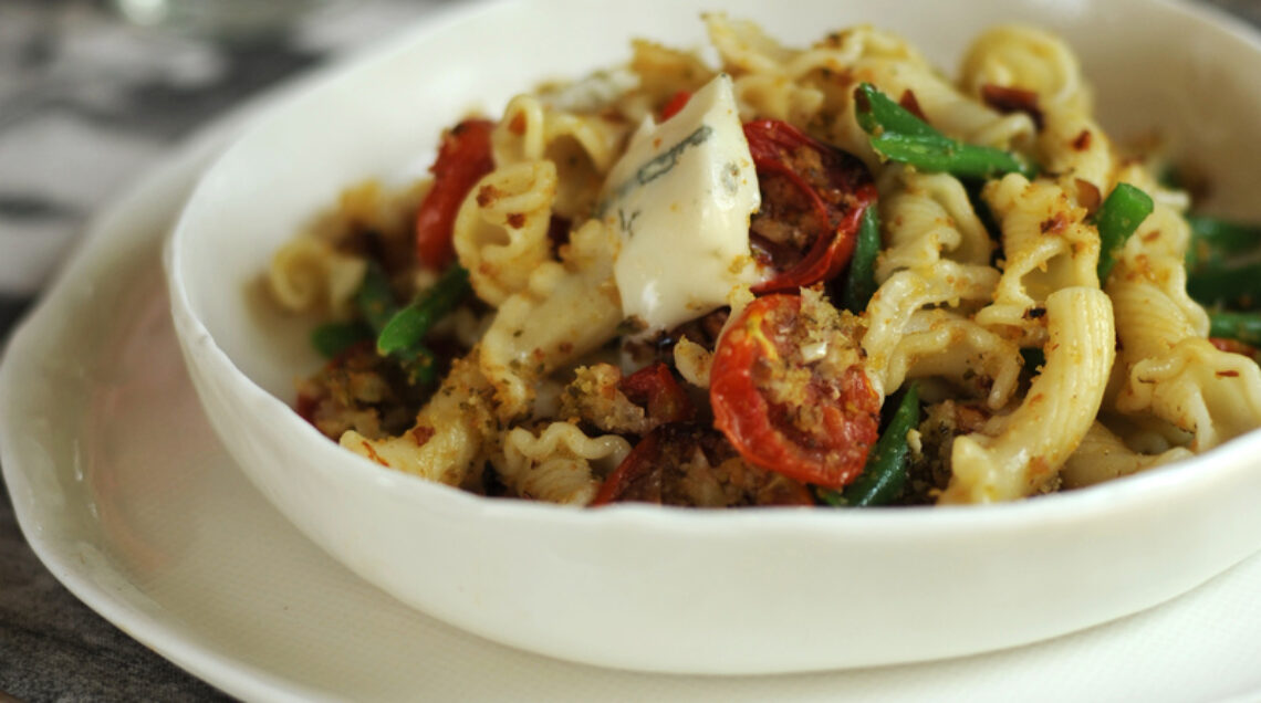 3) Mondate i fagiolini, lavateli e tagliateli a fettine in sbieco. Portate a ebollizione abbondante acqua, salatela e cuocetevi la pasta al dente insieme ai fagiolini. Sgocciolate il tutto, versatelo nella teglia dei pomodorini, mescolate e unite il gorgonzola a fiocchetti.
