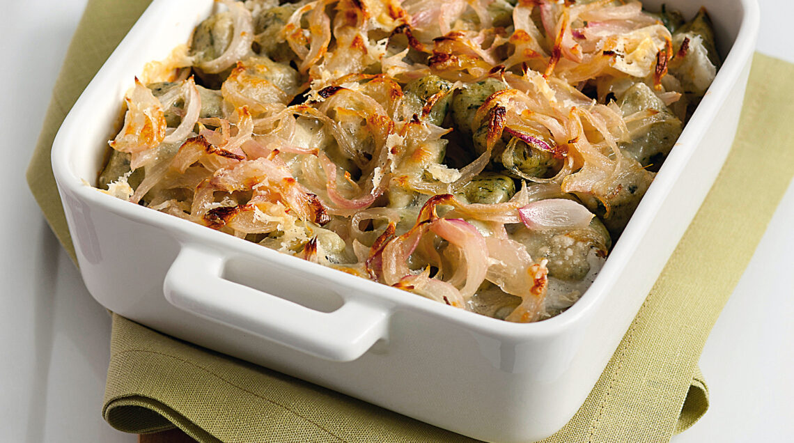 7) Tuffa gli gnocchi nell’acqua bollente salata. Man mano che salgono a galla, scolali con il mestolo forato e trasferiscili in una pirofila imburrata.