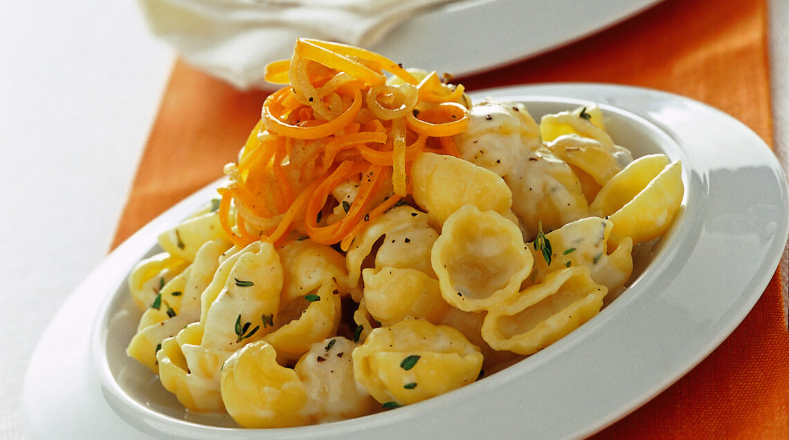 1) Per preparare la ricetta gnocchi con crema di gorgonzola raschia la carota, lavala, asciugala, riducila a nastro con un pelapatate e taglia poi ognuno a striscioline sottili. Sbuccia la pera e privala del torsolo, affettala, dividi ogni fettina a bastoncini e spruzzali con il succo di limone per evitare che anneriscano.