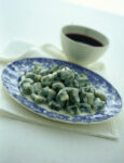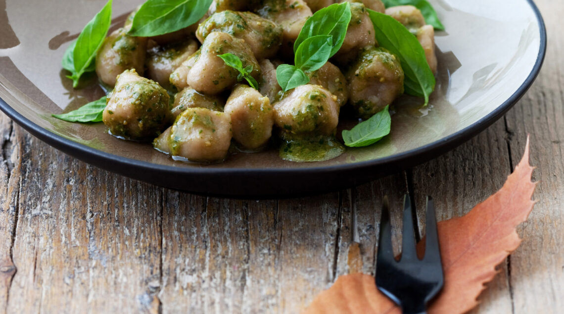3) Con le mani tira dei cordoncini di impasto, tagliali a tocchetti e lessali. Appena vengono a galla scolali, condiscili con il pesto leggermente diluito con l'acqua di cottura, guarnisci con il basilico rimasto e servi.