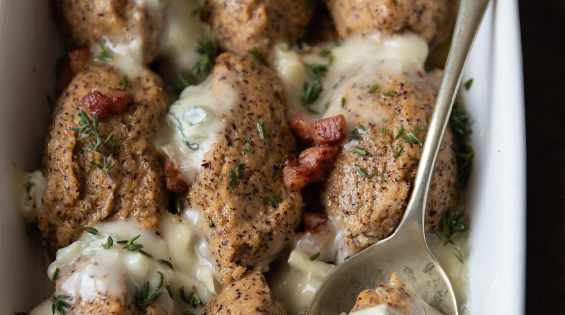 Farina di mais nero, gorgonzola e pancetta alle erbe regalano un primo piatto dal sapore verace