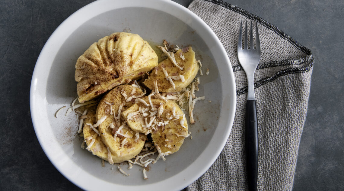 Dalla tradizione friulana, l'impasto degli gnocchi è arricchito con prosciutto e grana. Cotti a vapore sono conditi con burro nocciola e ricotta affumicata