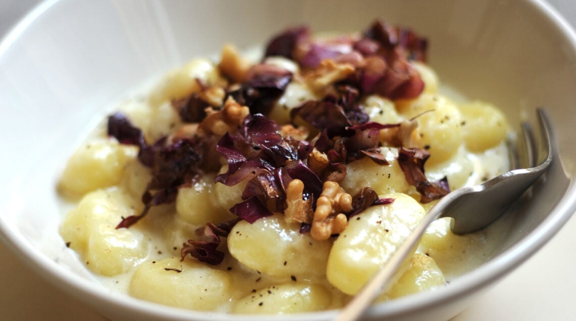 Un primo vegetariano ma robusto, pensato per le sere fredde quando serve un comfort food corroborante per riscardarsi. Gnocchi di patate fatti in casa e conditi con un nobile formaggio, il Taleggio, noci croccante e il radicchio, ortaggio invernale. Il boccone è morbido e saporito.