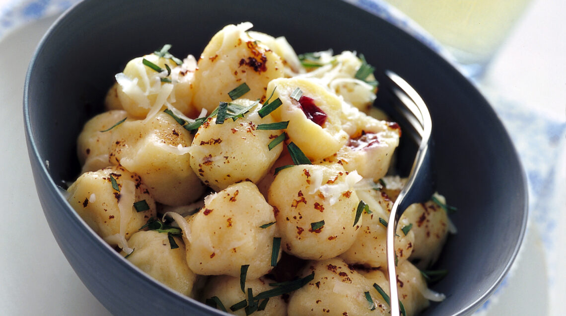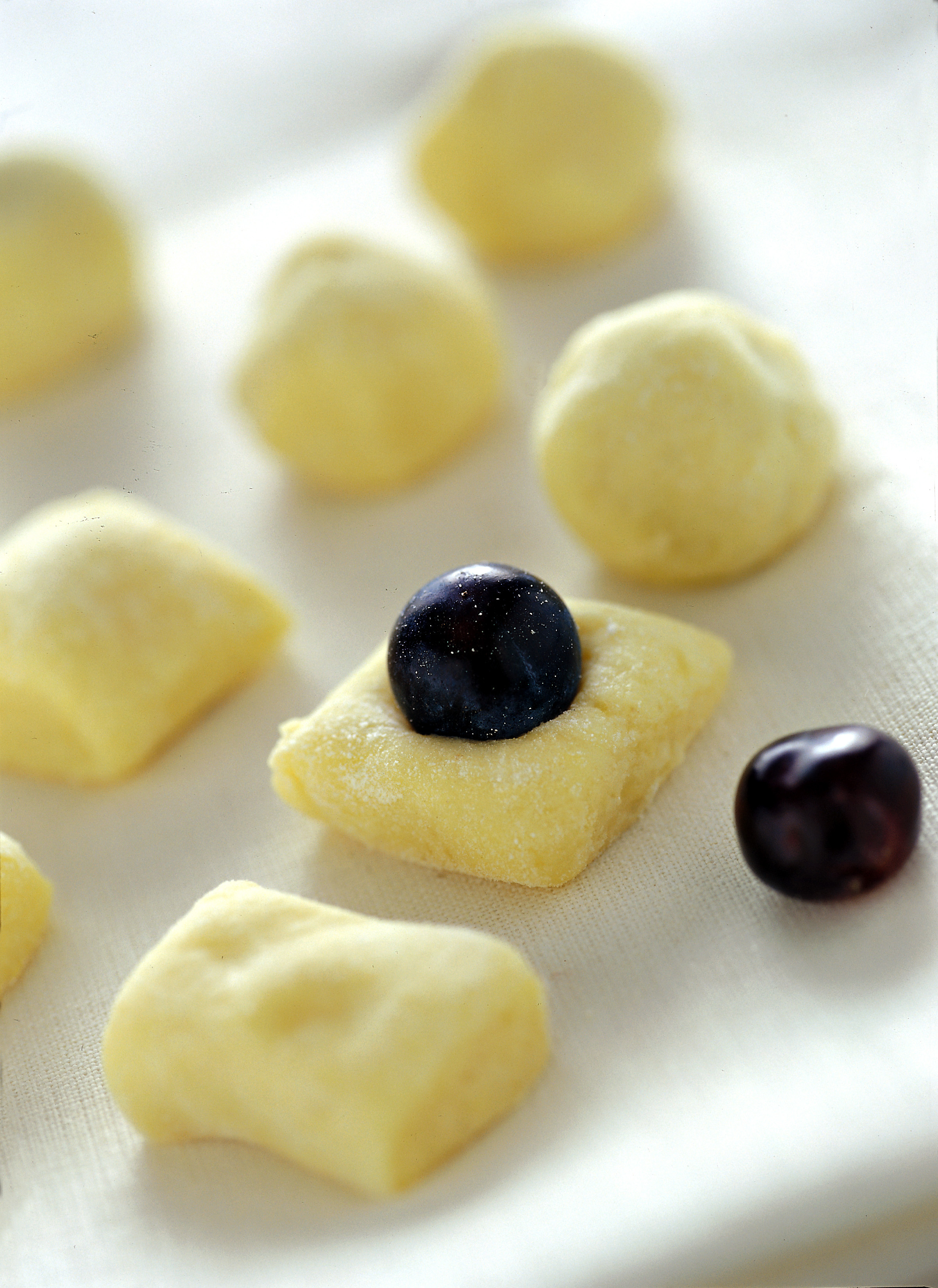 2) Adesso sbriciola le patate con l’apposito strumento facendole cadere direttamente sulla spianatoia leggermente infarinata, poi aggiungi la farina, l’uovo e una presa di sale. Impasta fino a formare un composto piuttosto morbido e omogeneo, poi forma con le mani dei cordoni di circa 2 cm di diametro. A questo punto, tagliali a tocchetti, farciscili con l’uva e chiudi nuovamente l’impasto.