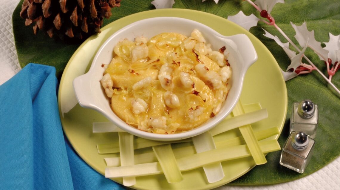 3) Affetta finemente la parte bianca dei porri e falli appassire nell'olio per 15 minuti a fuoco lento. Aggiungi la polpa della rana pescatrice tagliata a dadini piccoli, la maggiorana e il vino bianco e lascia cuocere per 10 minuti, poi aggiugni del sale e del pepe. Imburra sei pirofile individuali e sistema gli gnocchi alla romana di mare leggermente sovrapposti tra loro.