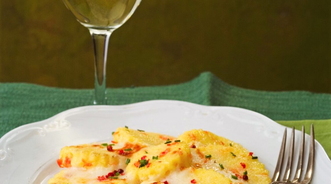 3) Versa il semolino sul piano di lavoro inumidito e stendilo con una spatola in uno strato dello spessore di circa un cm. Lascialo rassodare e taglialo a dischetti con un tagliapasta smerlato del diametro di 5-6 cm.