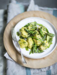 2 Lasciatele intiepidire leggermente, poi aggiungete le ortiche tritate finemente, 2 pizzichi di sale, il tuorlo e amalgamateli tra loro, quindi incorporate la farina e impastate senza lavorare eccessivamente. Lasciate riposare per 3-4 minuti.