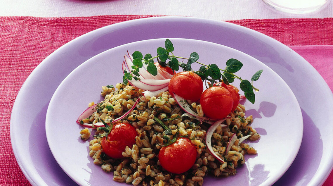 5) Servi l'insalata di farro con i pomodorini caramellati.