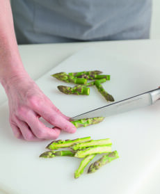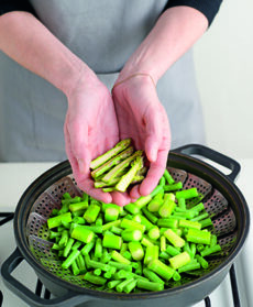Mettete il cestello sulla pentola semicolma d'acqua e iniziate a cuocere i fagiolini a vapore per 5 minuti, aggiungete i gambi degli asparagi e proseguite la cottura per 4 minuti. Unite anche le punte di asparago e cuocete tutto per altri 2-3 minuti. Al termine tutti gli ortaggi dovranno risultare leggermente croccanti.