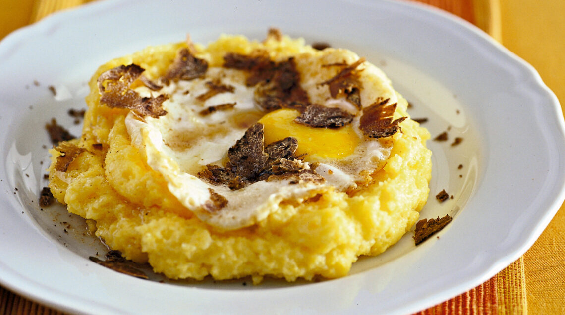 La polenta fatta in casa con farina di mais gialla, tradizionale o a cottura rapida, ha la consistenza e il sapore dolciastro ideale per accogliere uova al burro e il pregiato tartufo di Acqualagna. Facile ma raffinato, questo piatto è ideale anche per un'occasione speciale. L'abbinamento vegetariano si sposa anche con polenta di farina di castagne, di farina di mais bianco, con polenta di ceci.