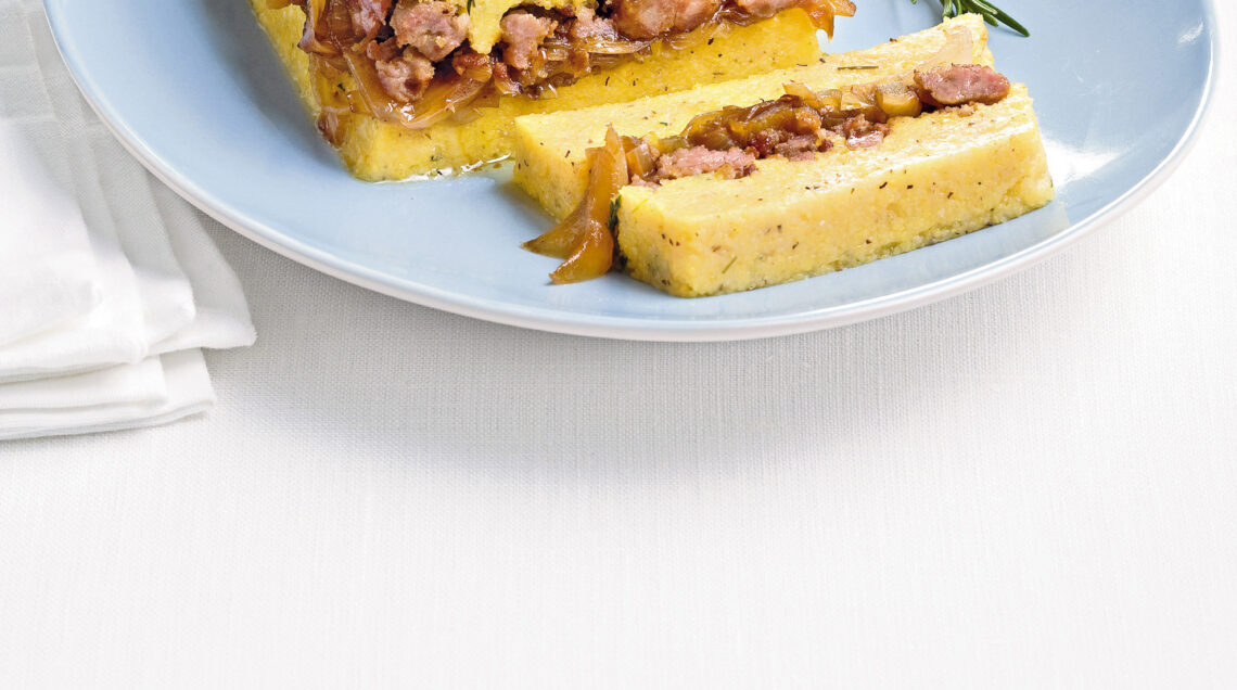 Una polenta sorprendente, preparata con farina di mais e farina di grano saraceno : corposa e robusta si presta allo sformato qui proposto, farcita con salsiccia e cipolle e aromatizzata al rosmarino. Potete preparare la cake in anticipo, tagliarla al forno e gratinarla al forno poco prima di servirla.