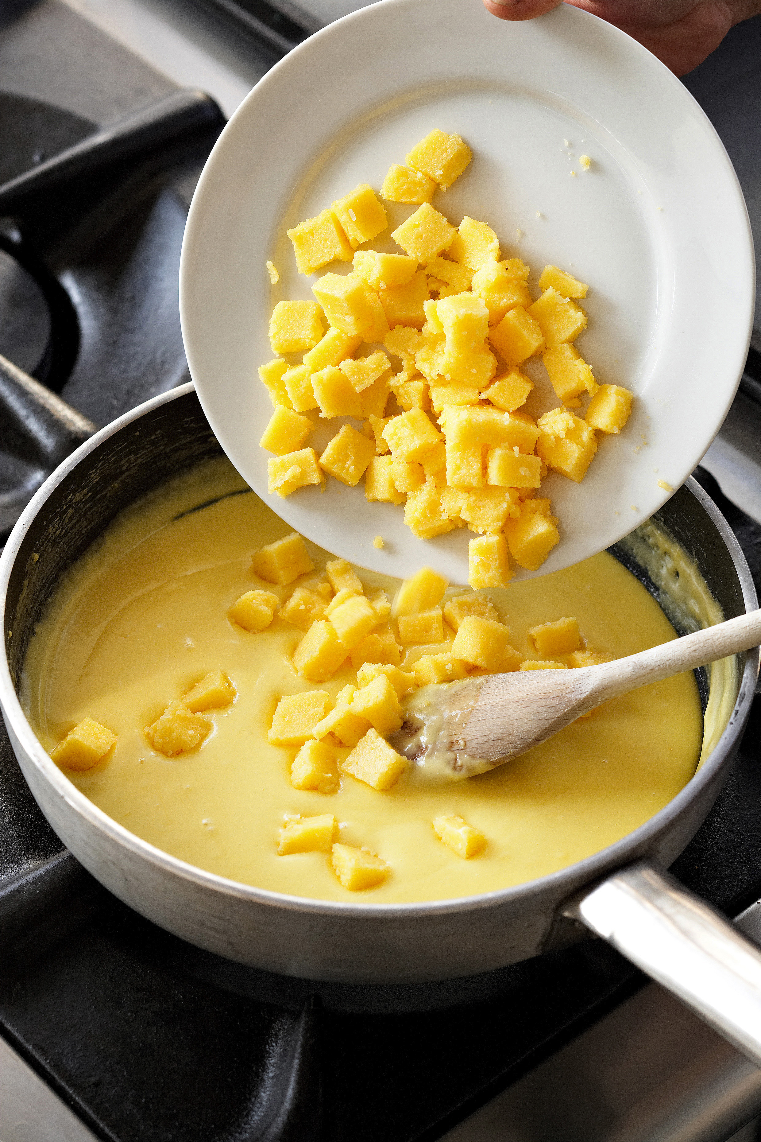 4) Una volta tagliata, unisci la Gruyère e il parmigiano, entrambi grattugiati, alla farina, al latte e ai tuorli. Fai bollire per 5 minuti e aggiungi, sempre mescolando, la polenta a dadini.