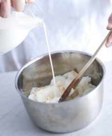 Fate soffriggere l'aglio in un tegame con il burro, eliminatelo, aggiungete il baccalà e cuocete, aggiungendo a poco a poco il latte e la panna, fino a ottenere un composto consistente.