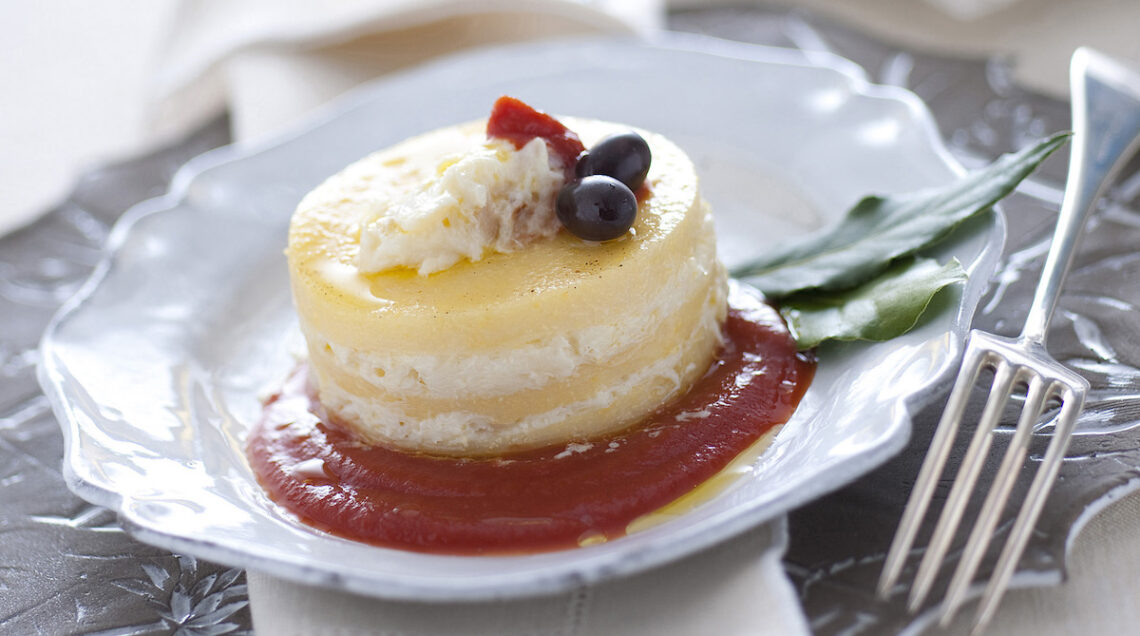 Ungete di olio 8 stampini da soufflé, inserite sul fondo di ciascuno un disco di polenta tagliato in misura, condite con uno strato di baccalà, ancora polenta, baccalà e così via fino a riempirlo. Passate in forno a 180° per 10 minuti. Distribuite sui piatti un velo di salsa di pomodoro, sformatevi le lasagnette e guarnite con le olive.