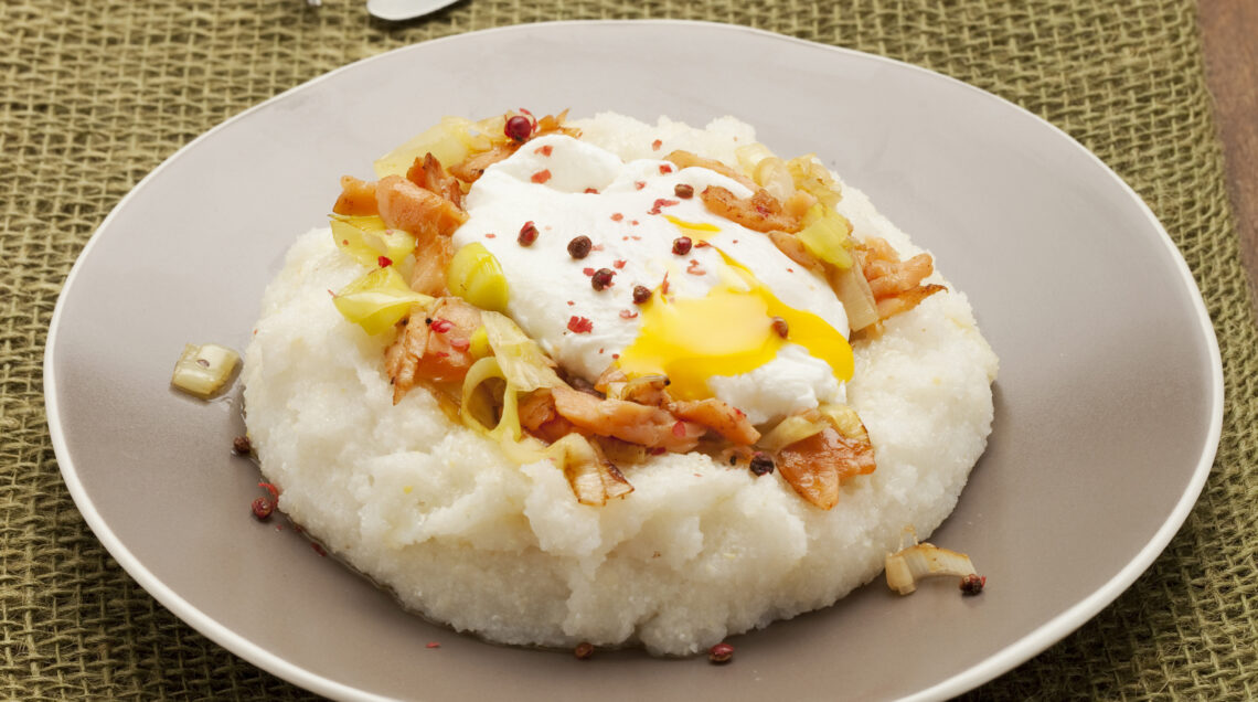 Soffice polenta bianca condita con salmone e uovo cremoso. Un primo che profuma di Cognac e pepe rosa, ideale da condividere con gli amici