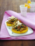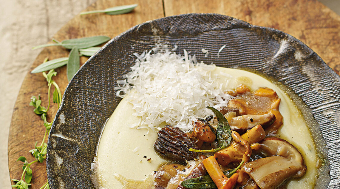 5) Quando la polenta è pronta, condiscila con il trito di erbe rimasto, un filo d’olio e il parmigiano. Regola se serve di sale, versa la polenta nei piatti, coprila con i funghi e servi, se ti piace, con altro parmigiano.