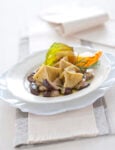 2) Nel frattempo fai rinvenire le spugnole secche una decina di minuti in acqua tiepida. Monda e affettate i funghi freschi misti (porcini e finferli). Scola bene le spugnole e, se occorre, passale con un panno umido (possono trattenere tracce di terra e sabbia), poi scottale in acqua bollente salata per circa 5 minuti.