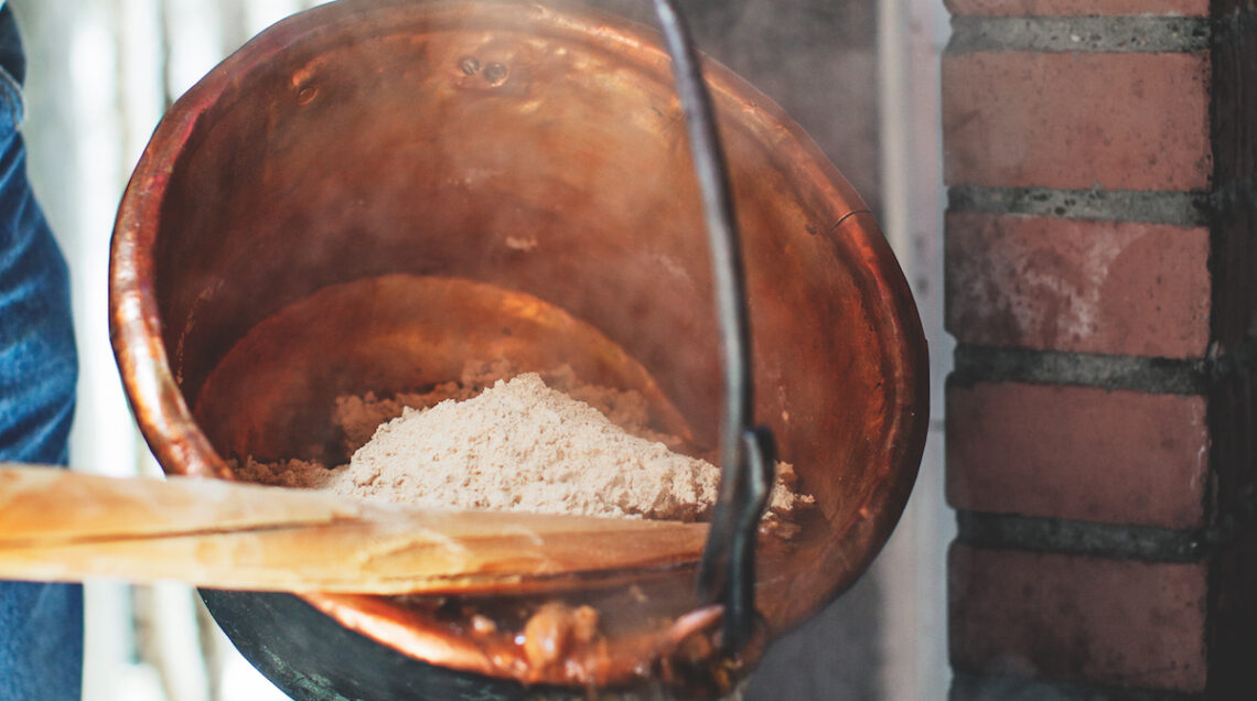 Portate a ebollizione 2 litri d'acqua in un paiolo di rame. Passate la farina al setaccio, versatela pioggia nell'acqua (non mescolate) e unite una buona presa di sale. Attendete che l'acqua riprenda il bollore, quindi versate quella in eccesso in un'altra pentola e tenetela calda a fuoco basso.