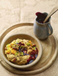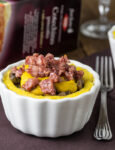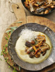 3) Servi la polenta con il ragù di pescatrice e una macinata di pepe.