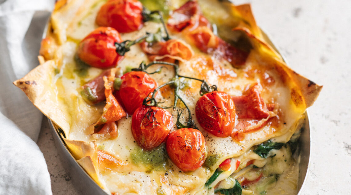 4 Sciacquate il grappolino di pomodori e adagiatelo sulla superficie delle lasagne; infornate a 200° per 15 minuti, completate con il prosciutto e cuocete per altri 10 minuti.
