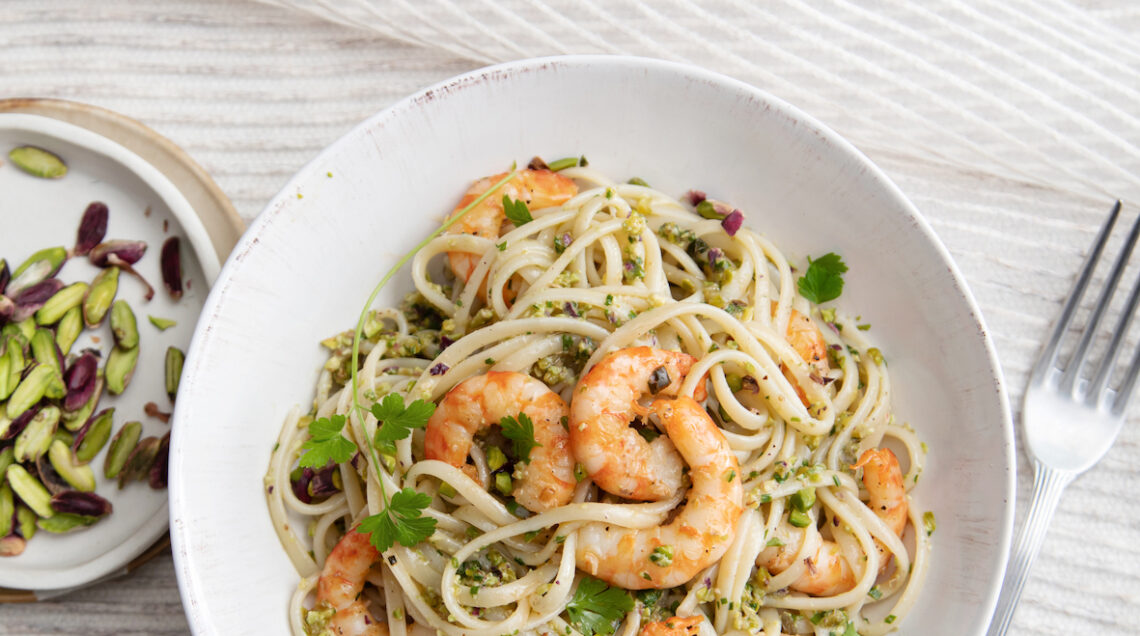 Le linguine al pesto si pistacchi con gamberi sono realizzate con la pasta 100% di grano duro certificato Senatore Cappelli di Le Stagioni d’Italia.