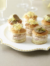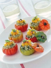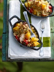 2 Sgusciate i gamberi, mantenendo attaccate le codine, eliminate il filetto nero sul dorso con uno stecchino, sciacquateli e asciugateli. Conditeli con un filo di olio, qualche goccia di succo di limone e di colatura di alici, poco sale, pepe e fateli marinare per 10 minuti.